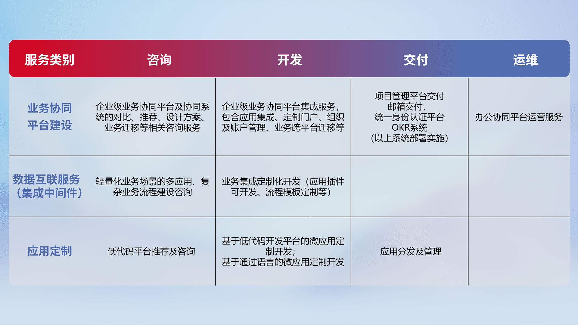 针对钉钉、、、企微、、、IDaas等平台级产品提供产品的规划、、方案、、交付、、、定制化开发等服务,,,,实现如统一协同办公、、、智能客户服务、、混合会议管理、、智能数据查询、、、、等业务场景,,,,实现数字化转型。。。。